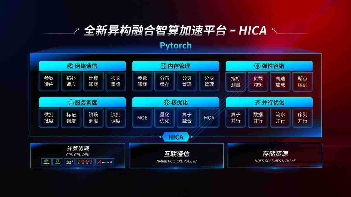 通过自研的服务层、、中间适配层、、、以及调度编排算法,,,采用数据并行、、模型并行等多种并行方式,,把并行计算任务进行有效的分解,,,,使其分别由相应的软件栈和算力资源来承接。。。当GPU资源变化,,HICA可以实时动态调度计算子任务并调整模型拓扑和架构,,,以充分聚合各种算力资源。。