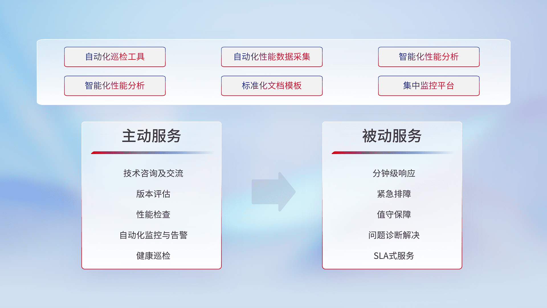 智能化工具和标准化文档,,,保障服务质量,,,,提供主动服务(包含技术咨询、、版本评估、、、、性能检查、、、、自动化监控与告警、、、健康巡检)和被动服务包含(分钟级响应、、、紧急排障、、、值守保障、、、问题诊断解决、、SLA服务)。。